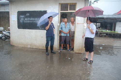 8月9日下午,区政协副主席郑永来冒着大雨,顶着大风来到了西城的大树下永宁江畔和西城辖区内的蔬菜大棚,葡萄基地,内流河边、下埭头的过渡房前,西城的应急避灾场所,了解受灾情况。图为郑永来观察长潭河的水位上涨情况和了解过度房居民的转移情况。