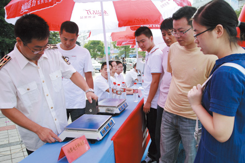 9月19日,在黄岩北门广场,一名质监人员正在向市民讲解如何防范电子秤作弊常识。今年9月为第13个全国质量月,市质监局联合我区相关部门开展了全国质量月活动,工作人员在活动现场除接受消费者咨询、举报和投诉外,还向过往群众宣传质量法律法规、市场准入制度及假冒伪劣商品鉴别知识等。