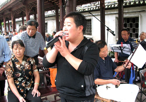 国庆长假期间,黄岩区孔园水阁凉亭内,曲声悠扬,热闹非凡,歌谜们纷纷上场唱红歌,庆祝建国六十华诞,亭内、亭外,歌声、掌声,呈现一派欢乐的景象。