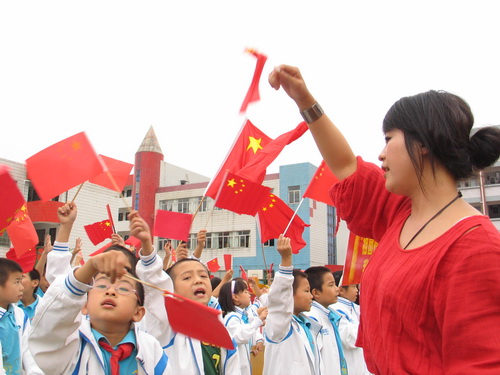 今年10月13日是中国少先队建队60周年纪念日,10月12日下午,黄岩区东城街道中心小学在该校操场上举行“领巾喜迎队日、红歌唱响校园”庆祝活动。该校2000多名师生一起同挥舞国旗唱响红歌,他们用饱满的精神,嘹亮的歌声来表达对祖国最深情的祝福。图为该校音乐老师正在跟学生一起唱响红歌。