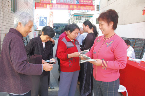近阶段,西城街道认真抓好第三批学习实践活动,大力宣传科学发展观。图为锦江社区工作人员向群众发放宣传资料。据悉,当日共发放了2000余份。