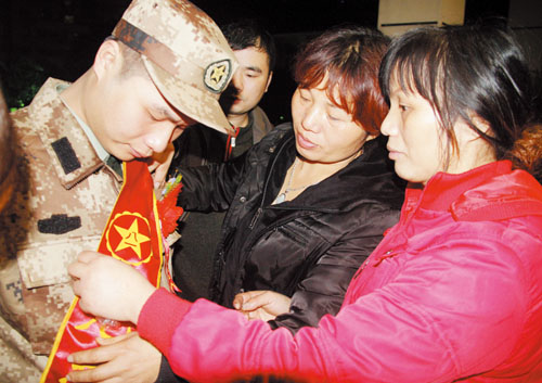 12月9日晚上,我区2009年度首批新兵欢送仪式在区人武部举行,来自各乡镇街道的30位新兵将远赴边疆。图为来自东城街道的新兵孙杨的家人正在为他戴好大红花和胸带。