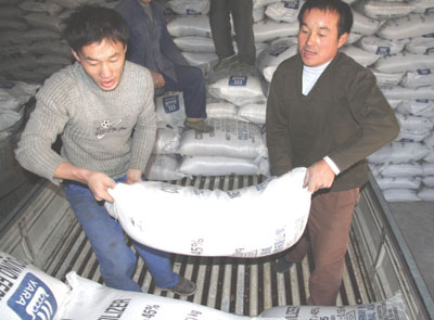 为了给广大农民朋友农业生产提供保障,连日来,我区各农资公司早动手早准备,积极调运优质农资。图为种粮户正在区供销农资有限公司搬运买来的化肥。
