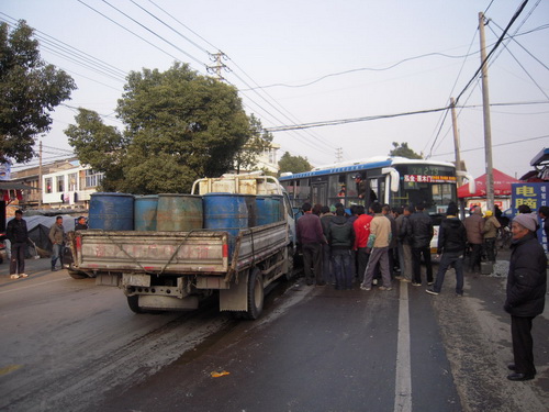 1月11日下午2时30分左右,黄岩公路部门接到96266电话举报,黄前线6K+700地段(澄江桥头王)路段发生四车连环相撞事故,路面被大面积的油所污染,造成交通中断,城西中队人员第一时间赶到现场,一边对过往车辆进行指挥疏导,一边对现场路面油污染情况进行勘测,并与养护人员联系,进行了防滑处理。由于发现及时和处理得当,第一时间确保了公路畅通。