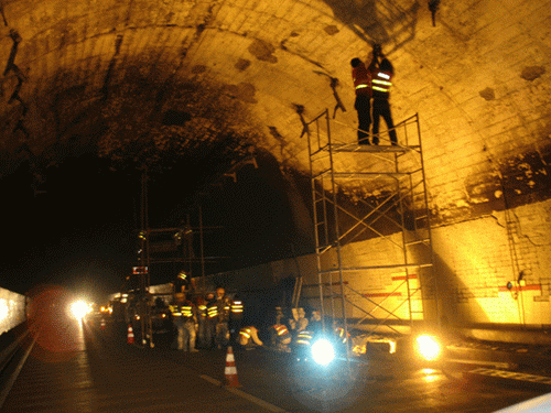 甬台温高速公路台州段大溪岭-湖雾岭隧道(温向)于元月6日凌晨4时50分左右,因货车自燃8辆宝马车被烧成废铁,损失千万,致隧道设备受损。于元月13日早上6时开始封道抢修,经过51个小时的奋战,现已全部完成照明、监控等机电设施维修及隧道顶衬砌表面处理,并于今天上午(元月15日)9时恢复正常通行。图为抢修现场。