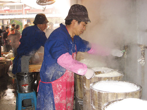 连日来,笔者在宁溪镇看到多个年糕制作场所生意火爆。传统新春佳节对山区群众来说是最盛大的节日,家家户户都要杀猪捣糕做糍粑喜迎佳节。时下春节将至,当地群众忙着赶制年糕。图为当地一家年糕加工厂工人正在做年糕。