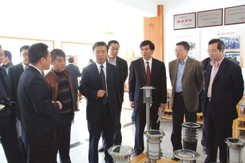 4月9日上午,黑龙江省伊春市委书记许兆君率该市党政考察团一行19人来我区考察,实地走访考察了中国公元集团浙江公元太阳能科技有限公司和黄岩商业街区。市委常委、区委书记陈伟义,副区长吴继业参加考察。图为考察团一行在浙江公元太阳能科技有限公司参观产品陈列室。