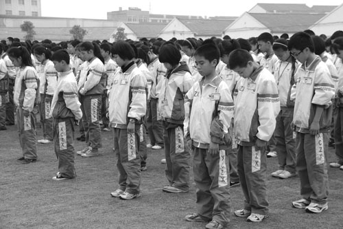 4月21日中午,西城中学九百多名师生一同在国旗下默哀,为青海玉树地震中逝去的生命志哀,为幸存者祈福。