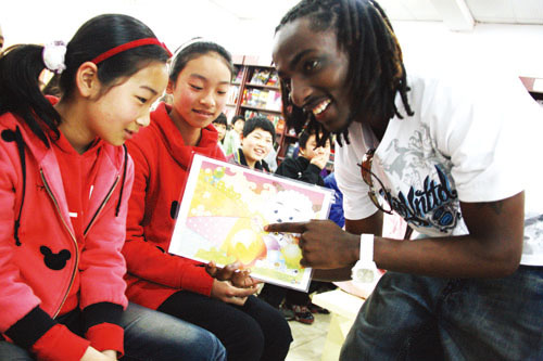 为配合我区首届全民读书月活动,近日,区教育局、区文广新局、区文联、黄岩新华书店和黄岩博瑞国际英语、清华少儿英语培训机构联合举办了百名学生大声说英语活动,激发学生学习英语的兴趣,提高英语口语交际应用能力,受到学生和家长的欢迎。图为黄岩博瑞国际英语培训机构的外籍教师正与学生互动。