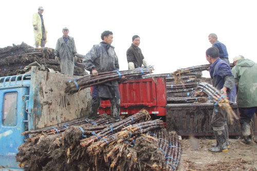 立夏已过,市场上甘蔗销售形势越来越好。院桥镇甘蔗种植户把原先贮存在地下的甘蔗装上车,准备运往上虞等地。