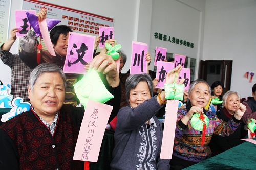 5月12日是汶川大地震两周年的纪念日。5月11日上午,东城街道桔乡社区举行了“汶川加油、玉树加油”纪念活动。在活动中,该社区的30多位居民一起做荷包、写祝福语、点蜡烛和在祝福墙上贴祝福语等活动,希望逝者安息,生者坚强。图为社区居民们手拿亲手制作的荷包和祝福语一起为灾区人民祈福。