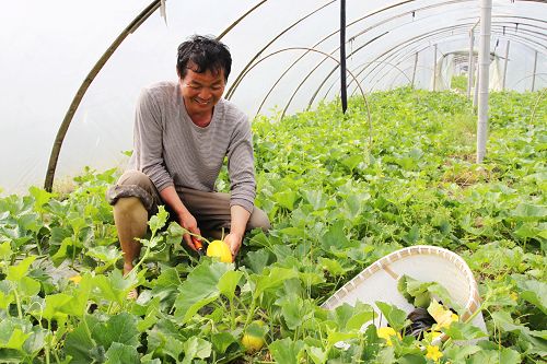 院桥镇洋岙村种粮大户陈忠岩今年在种足130亩早稻的基础上,又种植了6亩大棚黄金瓜、,由于他善于科学种植,精心培育管理,黄金瓜结果满地,目前已成熟开始采收上市,预计亩产2000多公斤,每公斤价格在5元左右。图为是5月16日,陈忠岩正在采收黄金瓜。