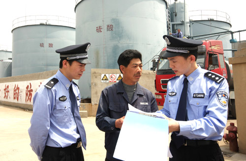 黄岩公安分局在“世博安保环沪护城河”行动中,针对该区化工厂多,化学危险品多的情况,全力做好危险品生产、储存场所等重点部位的管控工作,确保不发生安全事故。图为该局江口派出所民警正在化学危险品仓库检查安全工作。