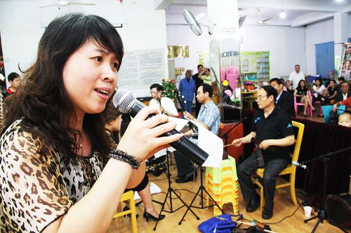 5月23日晚上,东城街道海棠社区在社区活动室举行“和谐邻里、同展才艺”邻居节大联欢活动。本次活动邀请了40多位温岭的文艺爱好者一起参加,大家一起在唱歌、舞蹈、相声和小品等文艺节目中进行展示和交流,进一步拉近了远近邻里之间的距离。图为来自温岭的文艺爱好者正在为大家进行演唱。