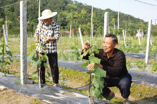 近年来,头陀镇积极探索农业规模化、集约化、高效化、特色化发展之路,对新岙、溪东、小里灰、双楠等村近2000亩整理后的田地进行流转,转包给当地种植大户种植水果、蔬菜、花卉等,农户则一边拿土地租金,一边外出经商、打工,实现“双赢”。图为种植大户牟锡贤夫妇正在双楠村租地里精心管理去年栽种的15亩葡萄。