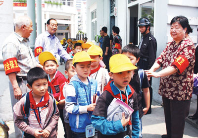 近日,东城街道滨江小学退休教师正在校门口执勤站岗。为了给学生营造良好、安全的环境,该校三十多位退休教师自愿成立了“夕阳红巡逻队”,他们将对学校周边的流动摊点进行监督,对周边安全隐患进行排查,让孩子们走得安全、吃得安全、学得安全。