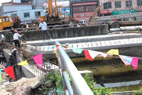 17日,施工人员正在吊装安装十路线官庄桥梁梁板。去年下半年,黄岩公路段向上级争取和自筹资金370万元,对黄岩境内的十路线、店尤线、高广线、西高线等农村公路上9座七八十年代建造的低等级的危桥进行改造,预计于今年8月底全面完工。