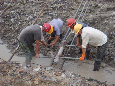 日前,记者来到江北区块D区块的施工现场,这里一片繁忙景象,工人们顶着烈日加班加点施工。图为工人们正在打锚杆为基坑做维护工作。