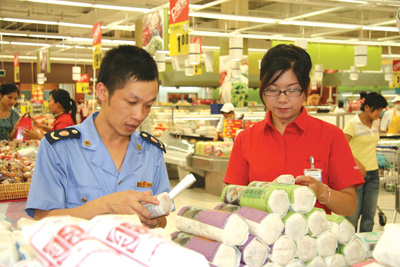 秋、国庆“双节”期间食品安全,黄岩工商分局开展迎“双节”食品安全专项整治行动,对辖区流通领域食品安全工作进行全面检查,确保市民安全购物。图为工作人员正在超市检查筒状月饼的生产日期。