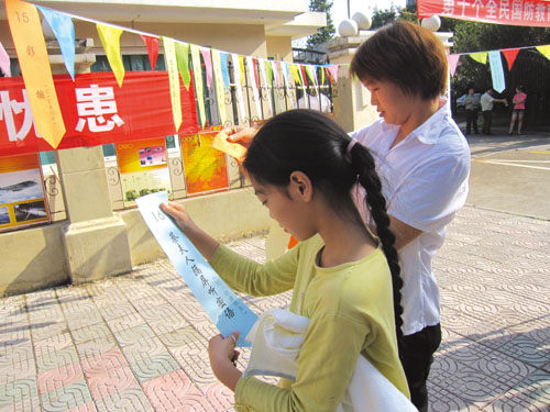 9月18日是第十个全民国防教育日,当天上午,区国教委在横街西路举办军事知识猜谜竞赛,并发放宣传册,增强市民的国防意识。图为一对母女正在仔细阅读谜题。