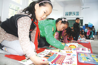 9月29日上午,樊川小学近百名学生参加了学校组织的以“祖国在我心中”为主题的百米长卷现场绘画活动。孩子们用优美的线条、亮丽的色彩描绘出一幅幅优美图画,向祖国母亲61华诞献礼。图为孩子们在百米长卷上作画。