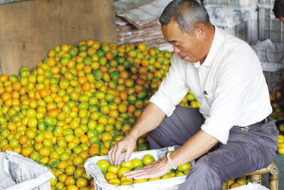近阶段,我区柑橘陆续上市,据记者从黄岩柑橘果品市场了解到,目前,离黄岩本地早上市大概还有20天左右时间,目前市场上出售的基本是早熟宫川。据果品销售商林老板介绍,今年受天气影响,我区柑橘产量减少,因此今年柑橘价格相对往年较高。图为果品销售商正在将柑橘整理成筐。