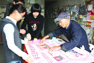 10月26日,头陀镇“集报王”陈文喜老人把他自己搜集的有关十七届五中全会内容的报纸拿出来,制作成一块块展板,悬挂在墙上,吸引不少大学生“村官”、党员干部、群众前来学习。图为陈文喜老人正在制作展板。
