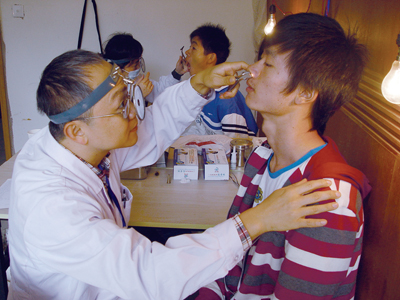 11月4日上午,来自平田乡潘家洋村的双胞胎兄弟蒋江平和蒋江斌,结伴上站参检,立志报国参军。图为兄弟俩正接受五官科目的检查。