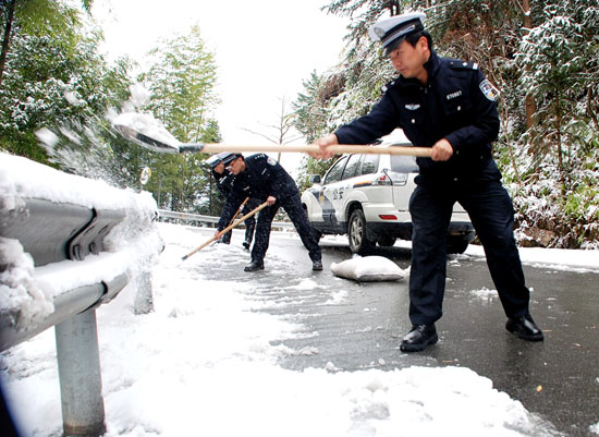 受强冷空气影响,黄岩遭遇百年不遇的暴雪天气,地面积雪深达10厘米左右。12月16日凌晨起,黄岩交警大队300多名交警在大队长潘晓阳的身先士卒下,携带铁锹、工业食盐等除冰融雪工具,奋战在抗雪保畅第一线。到16日下午,黄岩城乡公路没有发生一起重大伤亡交通事故,黄岩三百多名警力以实际行动创下抗雪保畅奇迹。