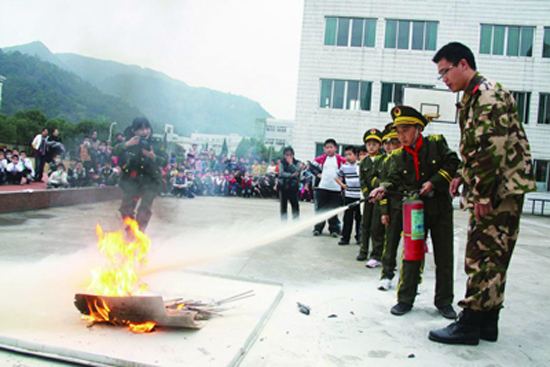日前,区消防官兵正在指导“小警员”进行灭火训练。区消防大队组织官兵深入东城街道中心小学开展“消防进校园”宣传演练活动。活动包括消防知识讲座、图片展、火场逃生自救、灭火器操作演练等,使广大师生能掌握实用的消防安全知识,真正实现 “教育一个学生,带动一个家庭,辐射整个社会”的目的。