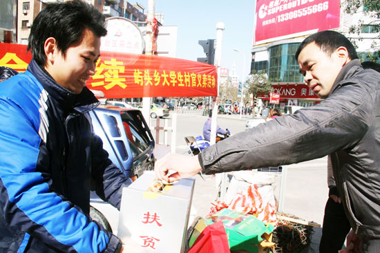 1月16日,屿头乡10位大学生村官在黄岩新世纪广场为白石村的高明萍开展“爱——让生命延续”爱心义卖活动。据了解,高明萍是云南藏族人,1996年嫁到黄岩区屿头乡白石村,从小就患有小儿麻痹症,2005年时不小心摔成全身瘫痪,现在病情进一步恶化,家里唯一的收入就是靠丈夫打零工,又加上家里还有两个未成年的孩子,根本无钱可以给她治病。得知情况后,10位大学生村官拿出自己养的鸡和收购的土特产进行义卖,把义卖所得的款项全部捐给她,帮助她走出困境。