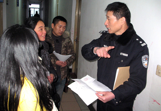 今年53岁的张冰,自2003年10月从车站派出所调入城西派出所以来,先后在黄岩西城街道的8个村居当片警,现为永宁社区、大树下村警务室片警。在社区民警的岗位上,张冰沉入社区,融入群众,真心付出,用他一心为民的工作热情,用他默默无闻、辛勤付出的积极工作,贴近了群众、惠及了群众、赢得了群众,构建起了融洽、和谐的警民关系,取得社区广大人民群众的信任和支持,用自己的实际行动书写了一位基层民警献身公安事业的无私精神。新年伊始,张冰被浙江省公安厅评为“2010年度全省优秀人民警察”。图为民警张冰正在耐心解答群众的咨询。