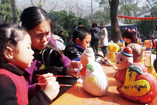 2月8日中午,一对母女正在九峰公园里绘制自己喜爱的卡通猫。春节期间,每天都有小朋友来这里一展身手,绘制造型各异的卡通塑像。这种含艺劳技既可锻炼儿童的动手能力,还可激发儿童的创造潜能,同时又能享受到创作的成就感和愉悦感,因此颇受儿童和家长的欢迎。