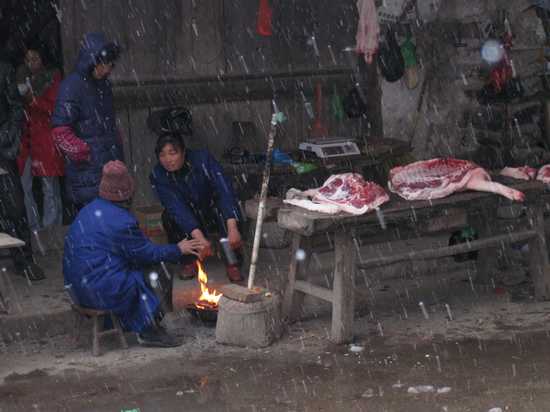 图为屿头大街街头小贩生火取暖。清晨下起的大雪,导致街头往来行人稀少,小贩们生意清淡。
