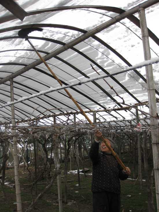 图为屿头乡农户用扫帚掸去塑料大棚上近3厘米厚的积雪。