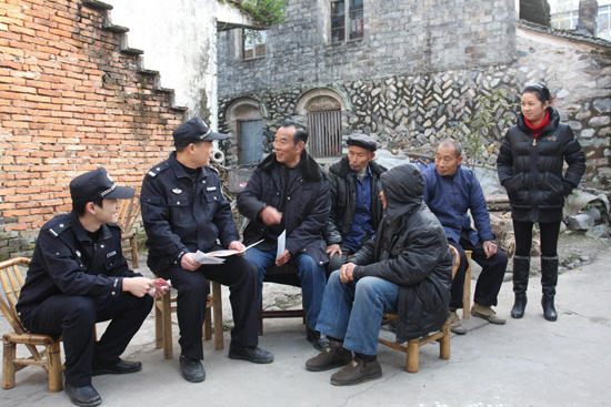 我区公安机关利用春节前后在家群众多的有利时机,组织民警开展“大走访”活动,图为宁溪派出所民警正在辖区村居向群众征求意见。