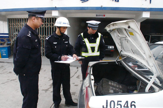 110指挥中心合同督察大队民警正在对一辆交警接警车装备情况进行督查。为提高广大市民的安全感、满意度,近日上午,区公安分局110指挥中心会同督察大队对各派出所民警的出警速度、携带装备、警容风纪等情况进行全面督查,发现问题及时整改。