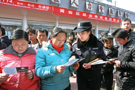 2月21日上午,城东派出所民警在人力资源市场向前来求职的民工讲解防范知识。春节、元宵节过后,又迎来了民工求职的高峰期,民警针对往年民工求职时易发的诈骗、盗窃等案件,印制防范宣传材料,提高民工的防范能力,避免不法侵害发生。