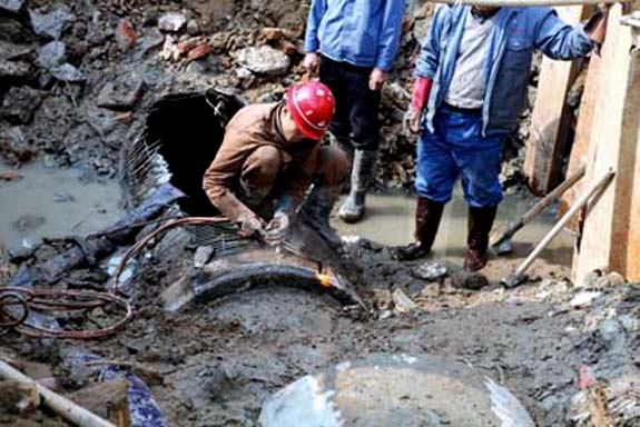 3月10日,工作人员正在紧急抢修一期供水管线。3月11日,本报报道了九峰路和橘乡大道十字路口及东官河路两处原水管线出现漏水,导致椒江及我区江口片区大面积停水的消息。经过有关部门的努力,截至3月11日下午5时左右,抢修工作全部完成,当晚7时,全线恢复正常供水。