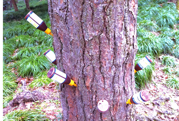 松树生病了也能挂“吊针”?这也许让许多人感到匪夷所思,然而,近日九峰公园内的上百棵松树却像人生病一样挂起了“吊针”。据区园林管理处相关负责人介绍,这些松树都得了松材线虫病,是一种毁灭性流行病,给松树挂“吊针”就是通过“松线光”这种生物农药提高松树的抵抗力,延缓病害的发生时间。