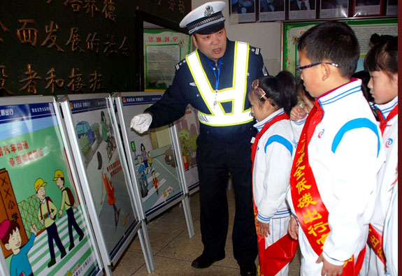3月28日,全国中小学生安全教育日,黄岩交警大队组织民警深入学校,向学生传授骑车、步行、乘车等安全知识,提高学生预防事故能力。图为民警通过宣传图展向学生讲解平安出行常识。
