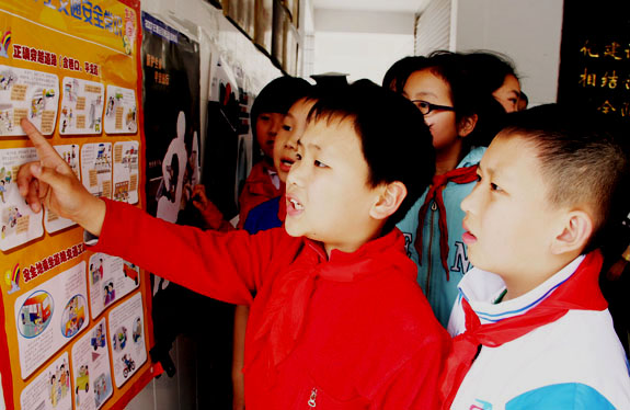 4月19日上午,东城街道中心小学学生正在参观交通安全图片展。在该校举办的以“绿色出行我参与”为主题的交通安全宣传教育活动中,以图片展、主题队会、发放宣传资料和制作绿色出行路线图等活动为载体,进一步提高了孩子们的环保意识和安全意识。