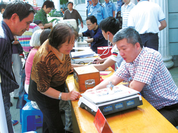5月20日是“世界计量日”,当天上午,黄岩质监分局在西街小区开展“计量进社区”惠民活动,工作人员正在教居民王阿婆识别电子秤作弊的方法。据了解,该局还将继续到医院、学校、市场等地,为百姓提供免费计量技术服务。
