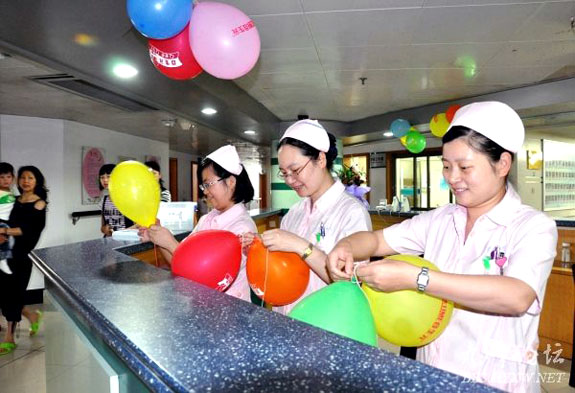 6月1日上午,台一医儿科的护士们为住院的小朋友每人送上一只漂亮的彩色气球。为庆祝六一儿童节,台一医儿科一大早就把科室布置得五彩斑斓,并为小患者们赠送了节日小礼品。