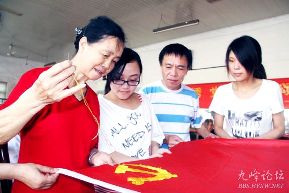 6月8日下午,东城街道砚池社区一位有60多年党龄的老党员卢荷妹正在跟大家一起绣党旗。该社区举行“绣党旗、颂党恩”活动,党员们边绣边唱,把对祖国、对党的热爱融汇在一针一线当中。