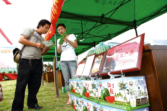 6月12日上午,黄岩瓜农协会工作人员在浙江省精品西瓜展示会上,向客商介绍“红耘”牌西瓜。当天,浙江省精品西瓜展示会、浙江省时令果蔬体验活动在路桥区黄琅开幕。我区瓜农协会带着“红耘”牌西瓜参展,该西瓜凭着良好的品质和口碑受到客商的青睐。