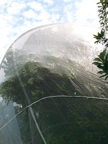 其实这是区林特部门技术人员今年新钻研出的“单树罗帐”。这样包了一层“蚊帐”的杨梅树,可以做到“物理隔绝”果蝇在成果期间的侵扰,不必再采用喷药等化学除虫的方法。提高了杨梅的安全性。目前,我区共有600多棵杨梅树采用单树罗帐技术进行后期管理,综合果农反映收效均不错,今后还将继续推广这一新兴技术。