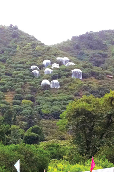 江口街道唐家岙村附近的一处山坡上,远远看去一朵朵白色的“蘑菇”,走近一看,原来是被白色纱网罩住的一株株杨梅树。