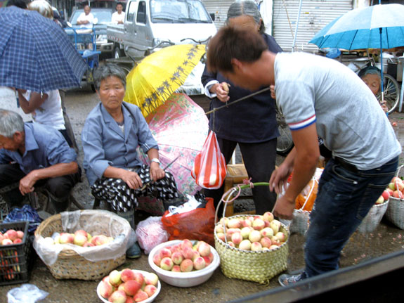 桃子味道鲜美,营养丰富,是人们最为喜欢的鲜果之一。近日,在北洋镇的某农贸市场上,路边摆满了鲜艳欲滴的桃子,引来不少群众前来购买。