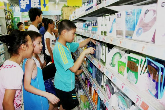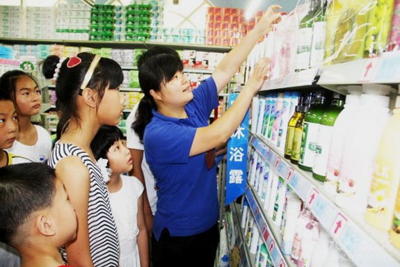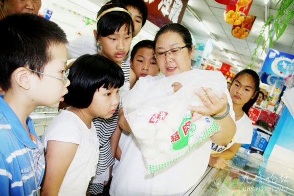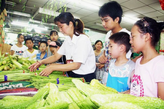 7月28日上午,位于东城街道山亭社区的世纪联华超市里,人们见到一群孩子忙前忙后的身影。他们“一本正经”地或当迎宾员,或帮工作人员收银结账、推车送货、整理货架,忙得不亦乐乎。他们正在参加山亭社区组织的青少年暑期活动,来超市体验生活。